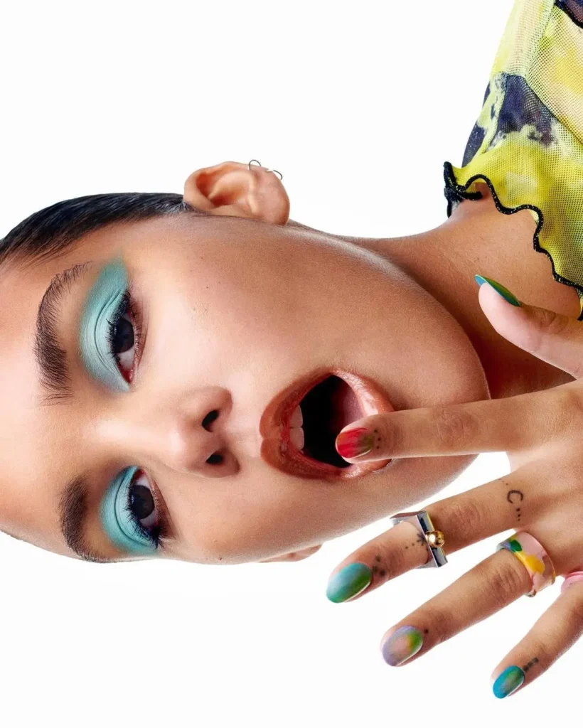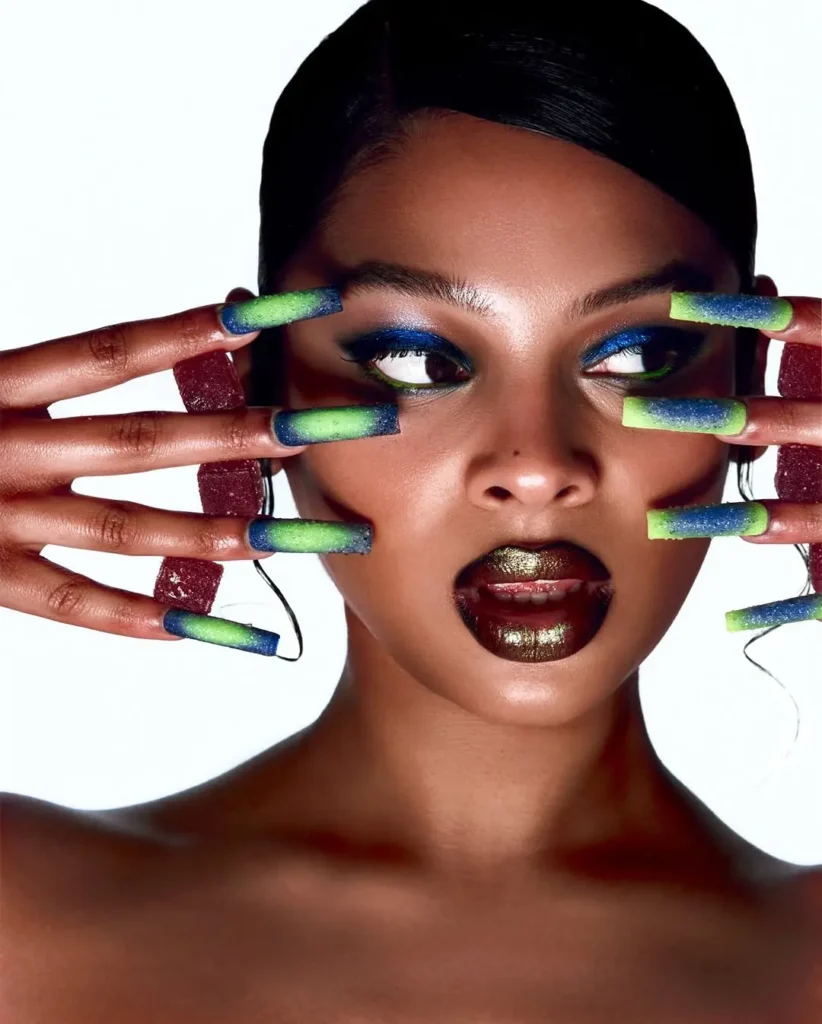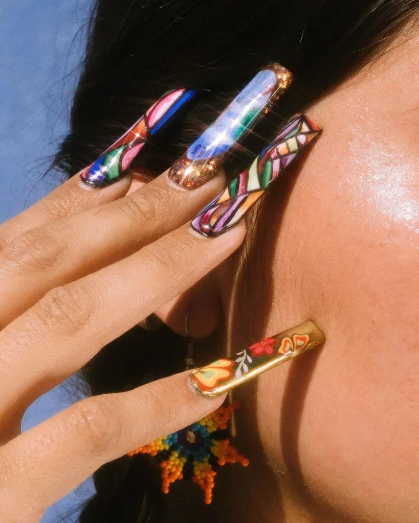 Students are trained in nail extensions including gel, acrylic, BIAB, polygel, and toe nail enhancements, along with advanced effects such as encapsulation, dry flowers, mylars, and baby boomer finishes. The course also introduces stamping, foils, water decals, bubble art, fruit-inspired designs, 3D flowers, and freehand artistry.